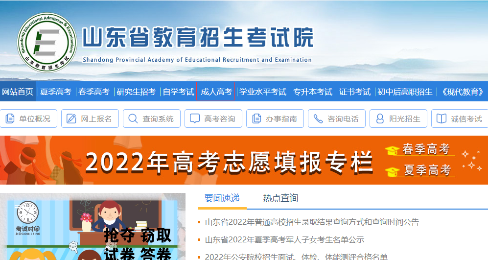 山东省成人本科报名官网是山东省招生办公室的官方网站,现在叫山东教育招生考试院,官网网址是http://www.sdzk.cn/,考生报考成人本科需要在指定的时间内,登录网站进行网上报名,具体的报名时间和方式下面给大家介绍一下。