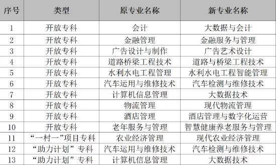 开放教育专科专业:法律事务、护理、药学、公共事务管理(学校及社会教育管理方向)、工商企业管理、大数据与会计、金融服务与管理、行政管理、小学教育、学前教育、汉语言文学、英语(语言教学方向)、广告艺术设计、建设工程管理、建筑工程技术、道路与桥梁工程技术、工程造价、水利水电工程智能管理、汽车检测与维修技术、计算机网络技术(网络管理方向)、计算机网络技术(网页设计方向)、大数据技术、电子商务、现代物流管理、旅游管理、酒店管理与数字化运营、数控技术、机电一体化技术、市场营销、智慧健康养老服务与管理、城市轨道交通运营管理。