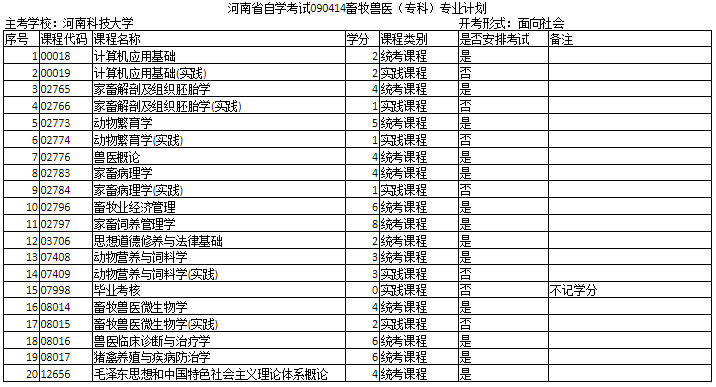 河南自考畜牧兽医专科专业考试科目