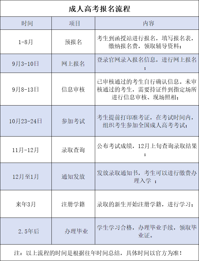 成人高考:9月初全国成人高考网上报名,10月底的一个周末考试。考试科目:(每门课满分均为150分)