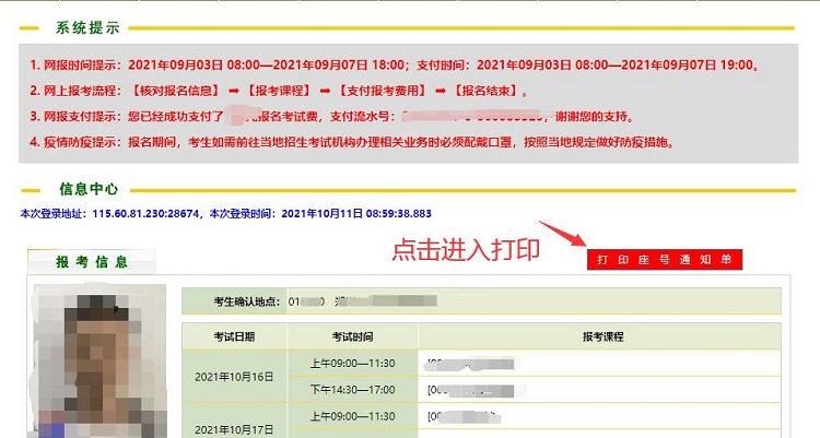 找到打印入口,点击进入,查看自己的考场座位信息。