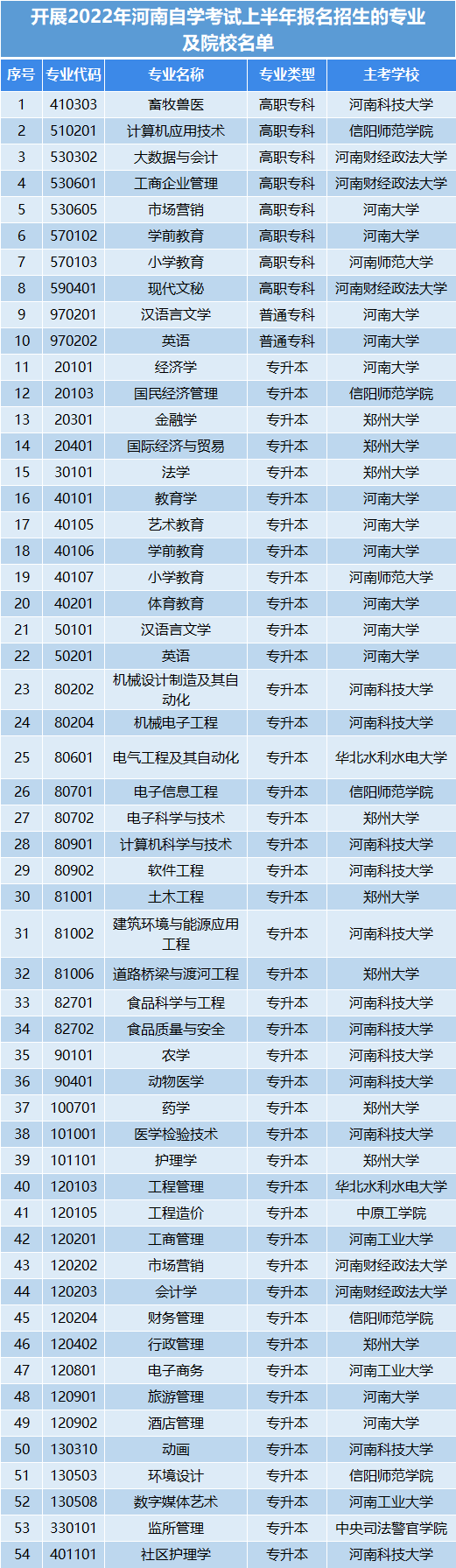开封自考本科有哪些学校?2022年开封自考本科报名已经开始,很所新生不清楚自考本科有哪些学校,下面给大家介绍一下: