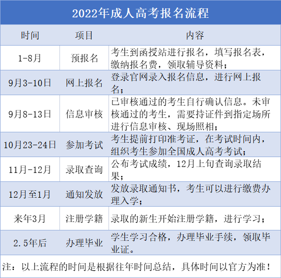 2025年河南省成人高考的报名时间预计会在9月3日-10日,完整的报名流程分为预报名、网上报名、志愿填报、信息审核和缴费几个阶段,考生在缴费成功以后才算完成正式报名。从2025年开始河南省成人高考不再进行大范围的现场确认,具体内容详见下表。