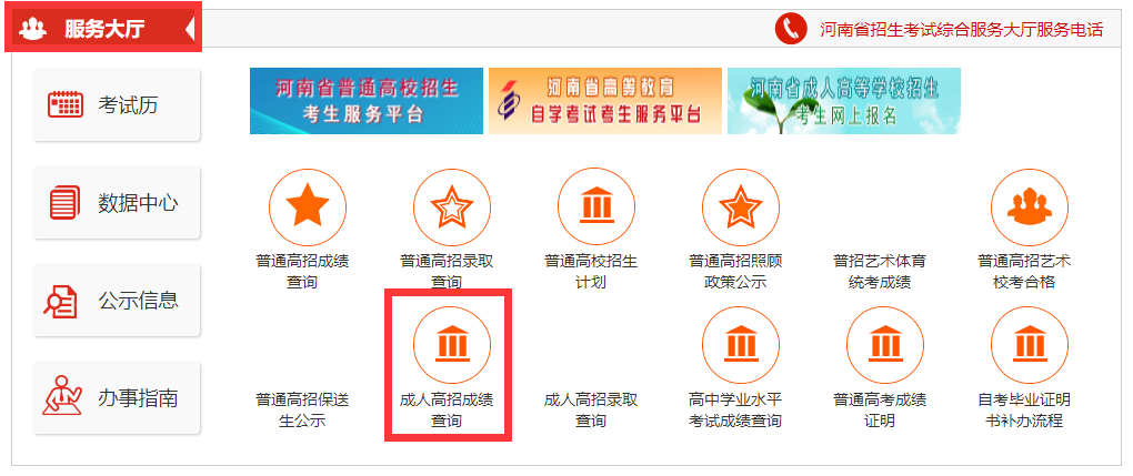 首先登录网址,下滑找到服务大厅->成人高招成绩查询