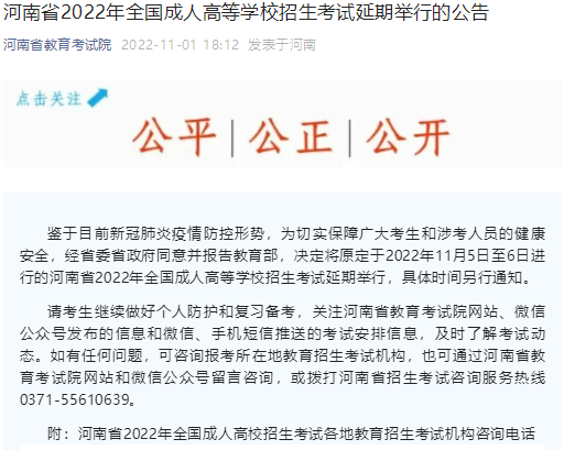 河南省教育考试院发布了延期举行2022年11月5日-6日的河南省成人高考考试,具体时间等待后续通知!目前根据通知来看,考试仅仅是延期举行,并未取消,请各位同学继续按照