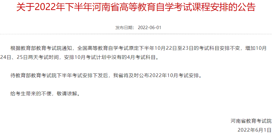 根据教育部教育考试院通知,全国高等教育自学考试原定下半年10月22日至23日的考试科目安排不变,增加10月24日、25日两天考试时间,安排10月考试计划中没有的4月考试科目。