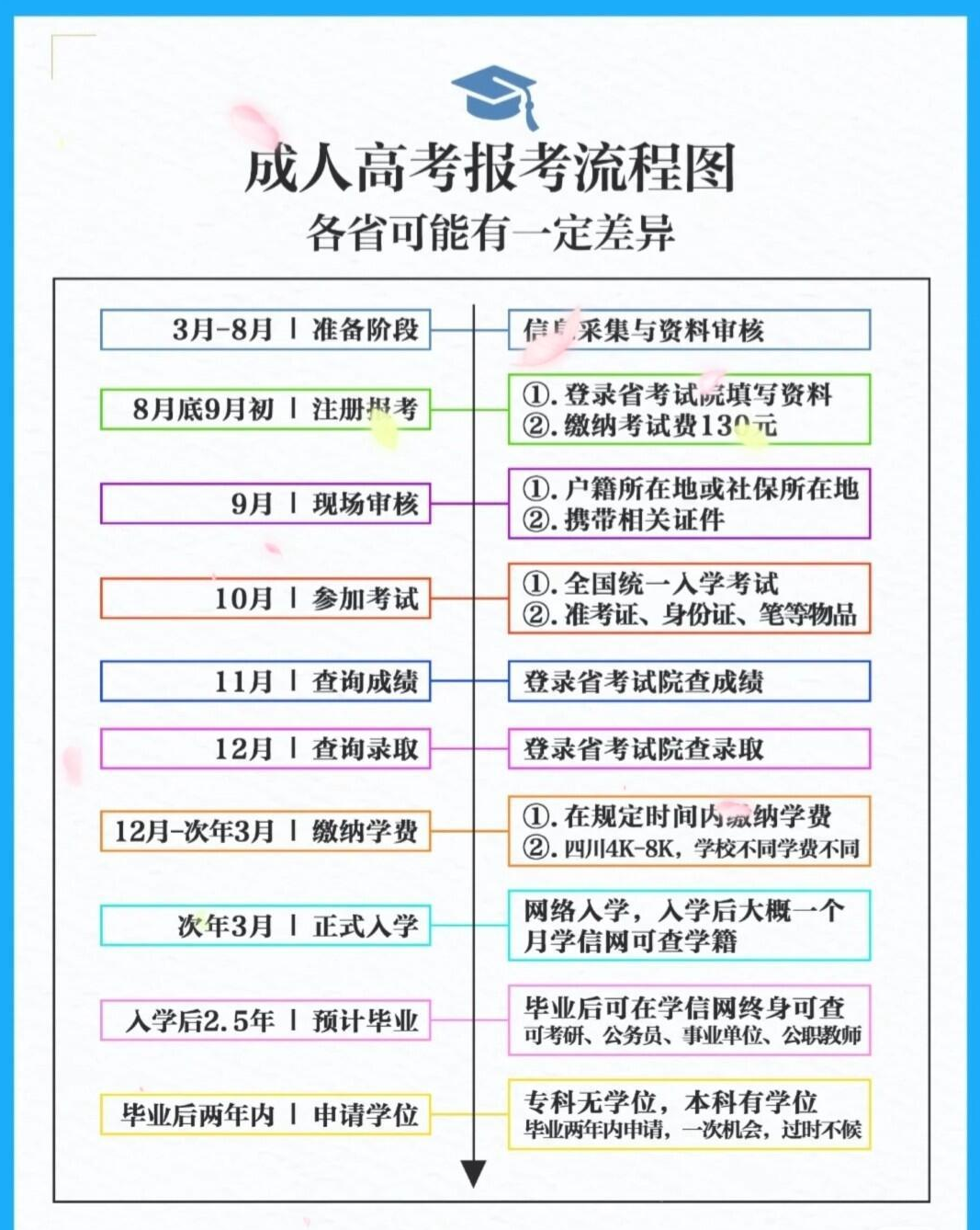 成人高考报名流程图来了!请收好!从报名到毕业,整个时间以及流程全部都给大家整理出来了。