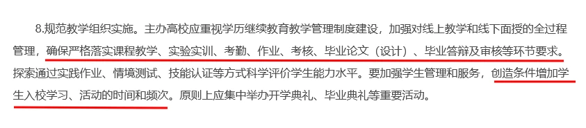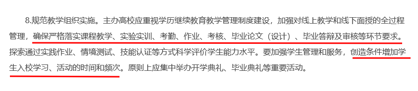 以往的成考线下授课是很少的,现改革要求加强对线上教学和线下面授的全过程管理,确保严格落实课程教学、实验实训、考勤、作业、考核、毕业论文(设计)、毕业答辩及审核等环节要求。