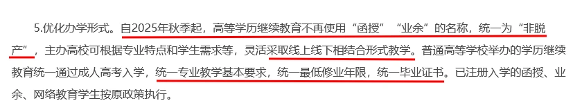 自2025年秋季起、高等教育继续教育不再有函授、业余的名称,统一为“非脱产”,采取线上线下结合形式教学。