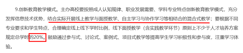 开展线上教学与面授教学、自主学习与协作学习结合的混合教学,线下授课至少占比20%。