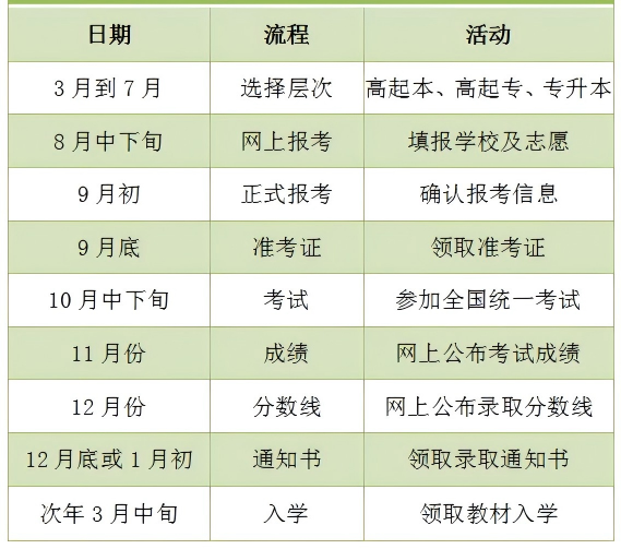 成人高考每年只有一次考试,报名时间一般为每年8月中旬进行网上报名,9月上旬进行现场确认。考试时间一般为10月第四个周六和周日,由国家统一安排和命题,专升本报名必须有已取得经教育部审定核准的国民教育系列专科学历才能报名。成人高考组成部分,属国民教育系列,列入国家招生计划,国家承认学历,参加全国招生统一考试,各省、自治区统一组织录取。是为我国各类成人高等院校选拔合格的毕业生以进入更高层次学历教育的入学考试。