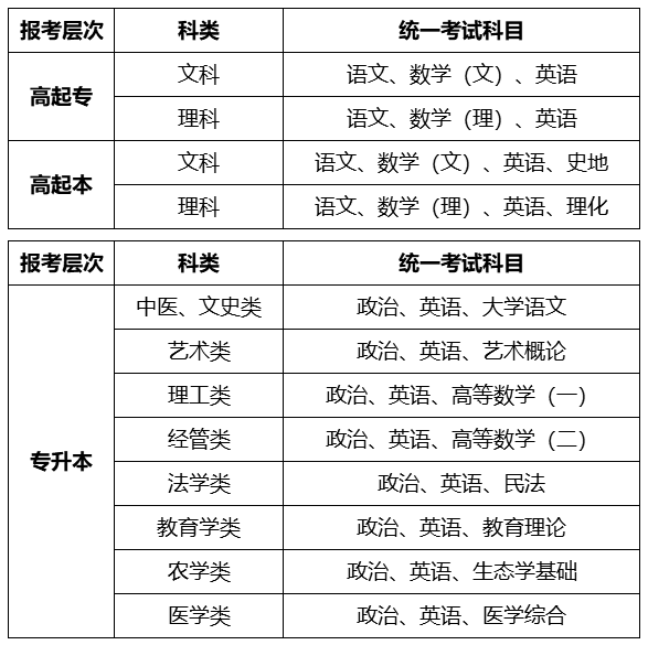 山东成人高考考试科目