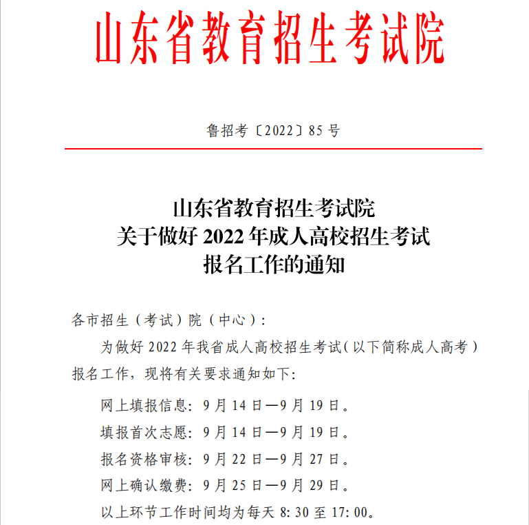 虽然山东成人高考报名时间确定的信息还没有在山东省教育招生考试院公布,但是省招办的文件已经下发,具体报名时间如下,山东成考网可以先给大家看一下!