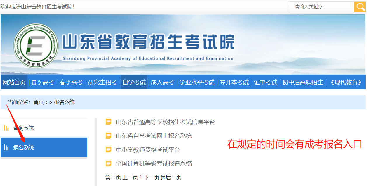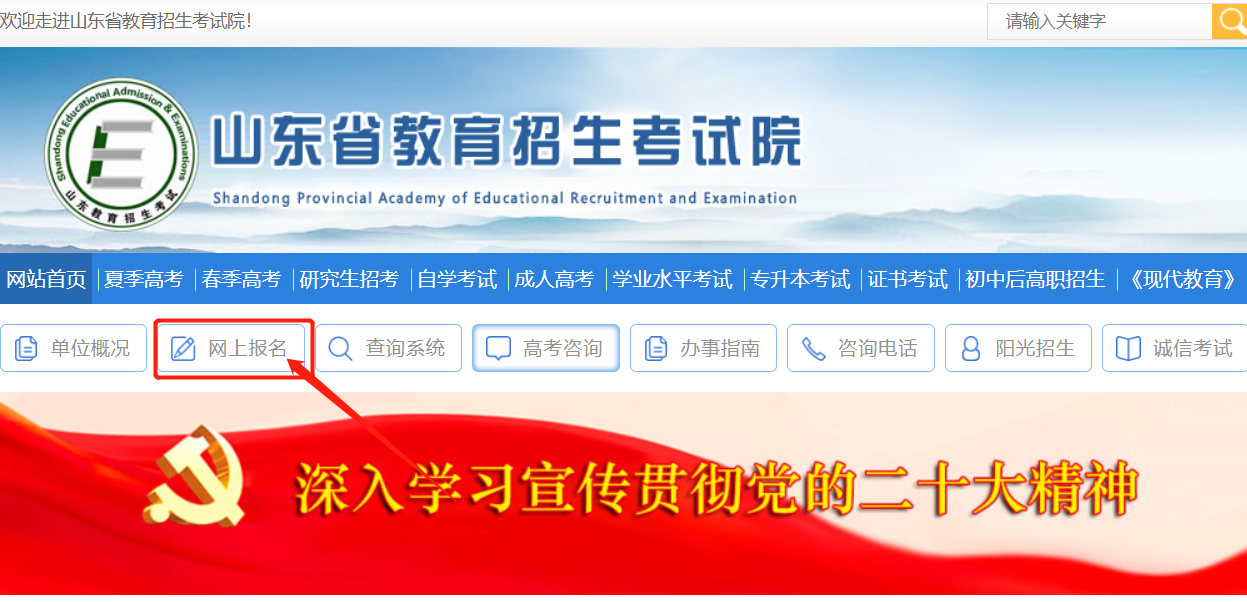 考生登陆山东省教育招生考试院网站(http://www.sdzk.cn/)-“网上报名”-“成考报名”-“网上报名系统”,认真阅读《山东省成人高等学校考试招生规定》、院校招生专业目录和有关说明。