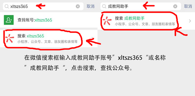 在微信里搜索本站微信公众号名称“成教网助手”或账号“xltszs365”