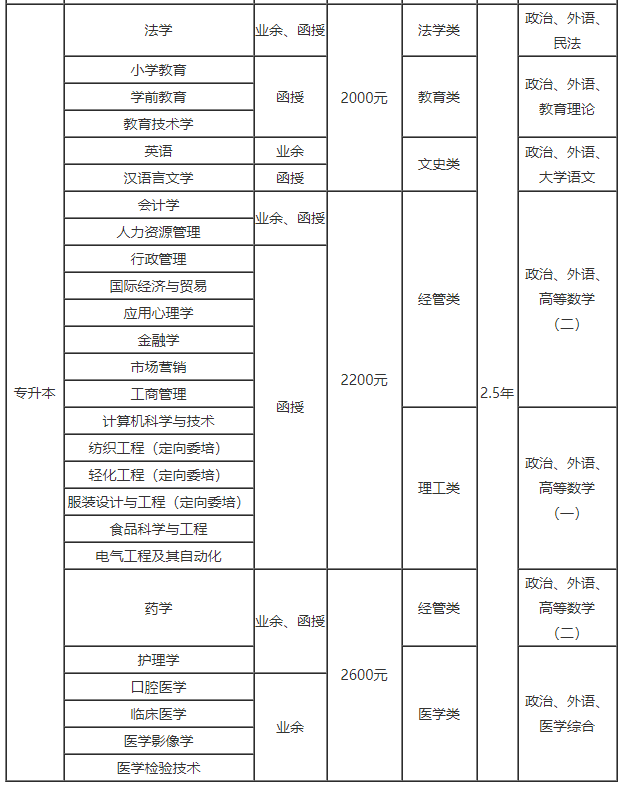 按学历层次分为高中起点专科、高中起点本科和专科起点本科三种。