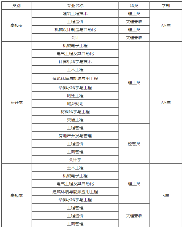 山东的建筑类大学目前主要招收成人本科专业,对于成人大专专业,只招收建筑工程技术、工程造价、机械设计制造与自动化、会计专业,并且学制都为两年半。