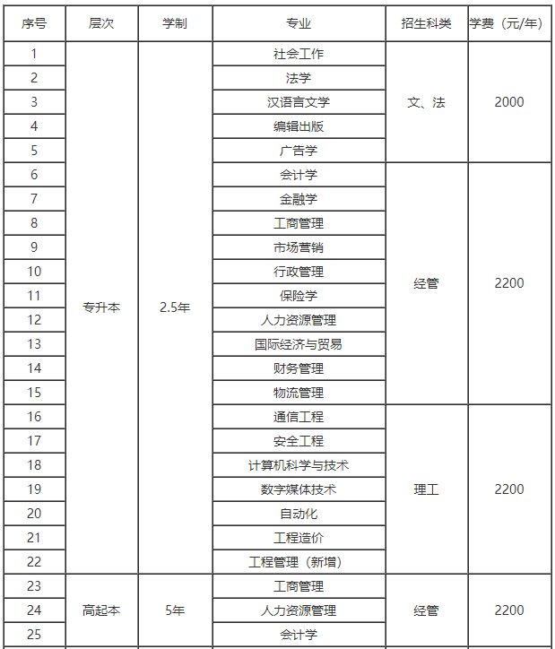山东的工商类学院成人高考招生专业目录(含学费收取情况)