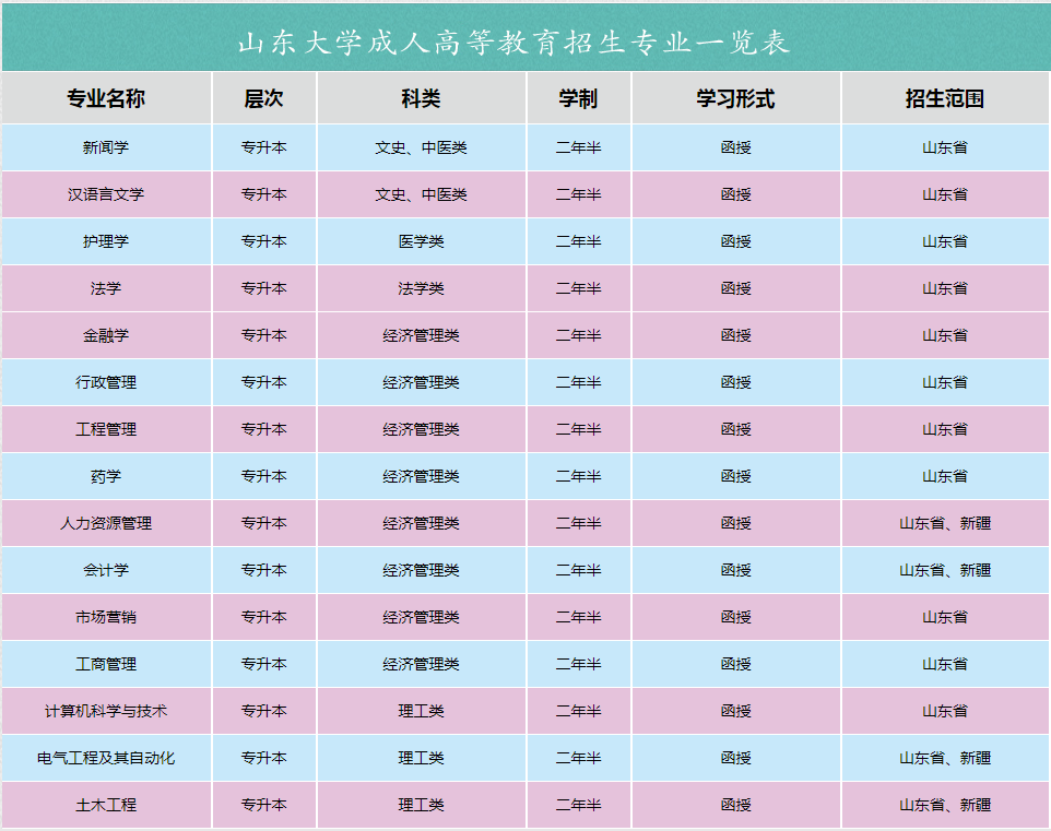 由上可以看出,山东的成人大学成人教育招生学制都为两年半
