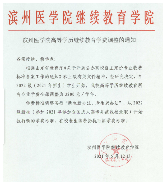 滨州的医学专业学院高等学历继续教育学费调整通知:学费标准调整实行“新生新办法,老生老办法”,从2022级新生开始执行新的学费标准,在校老生续费仍执行原学费标准。