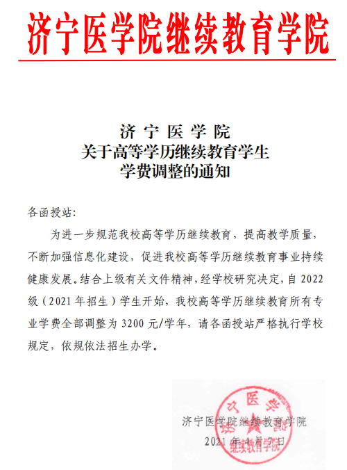 济宁医学院高等学历继续教育学费调整通知:学费标准调整实行“新生新办法,老生老办法”,从2022级新生开始执行新的学费标准,在校老生续费仍执行原学费标准。
