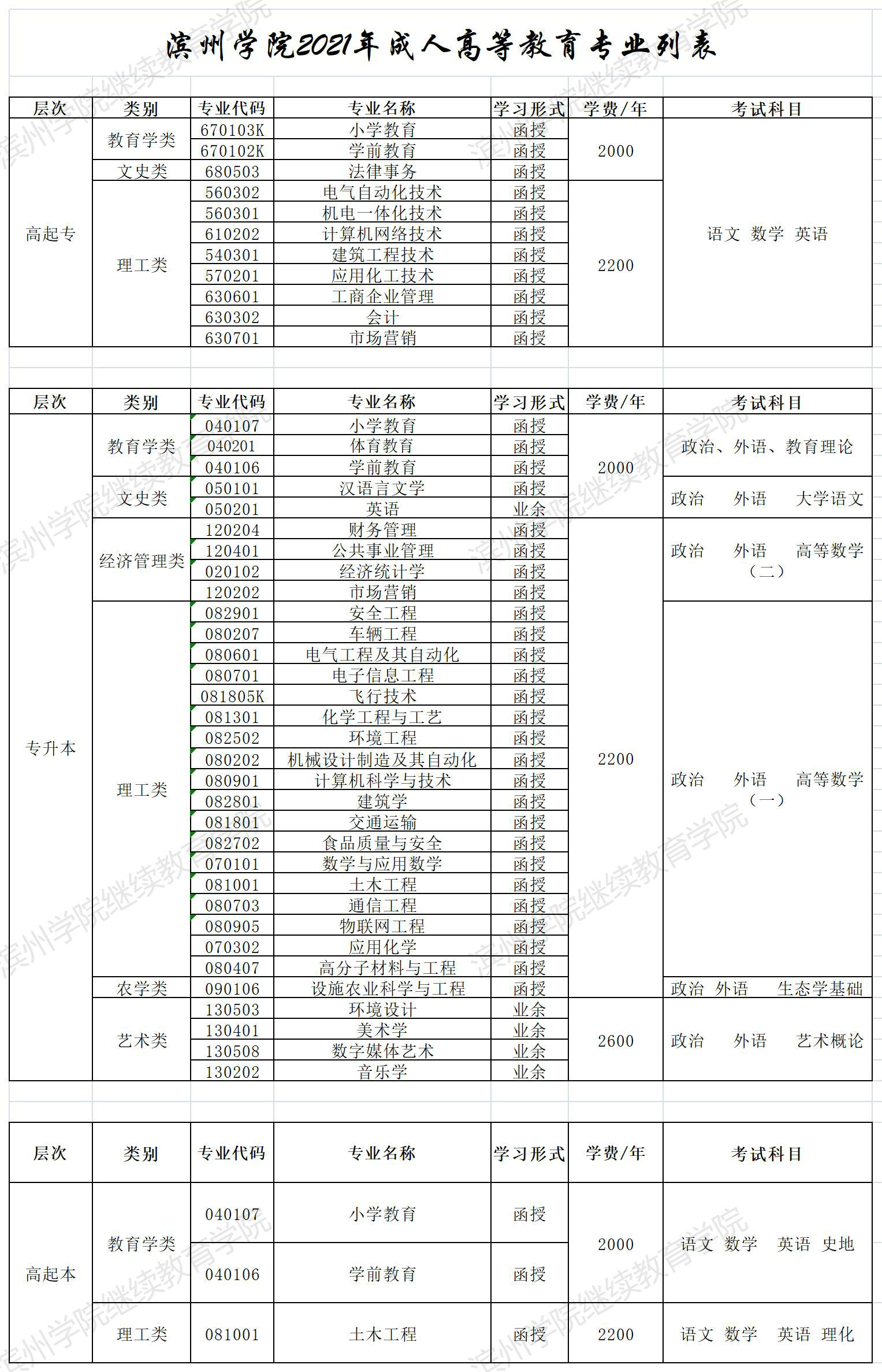 滨州的成人学院成人高等学历教育高起专、专升本学制两年半,高起本学制五年;学费按照省物价局、财政厅、教育厅核准的收费标准全额收取,每年学费标准见招生专业一览表,按学制年限收取。