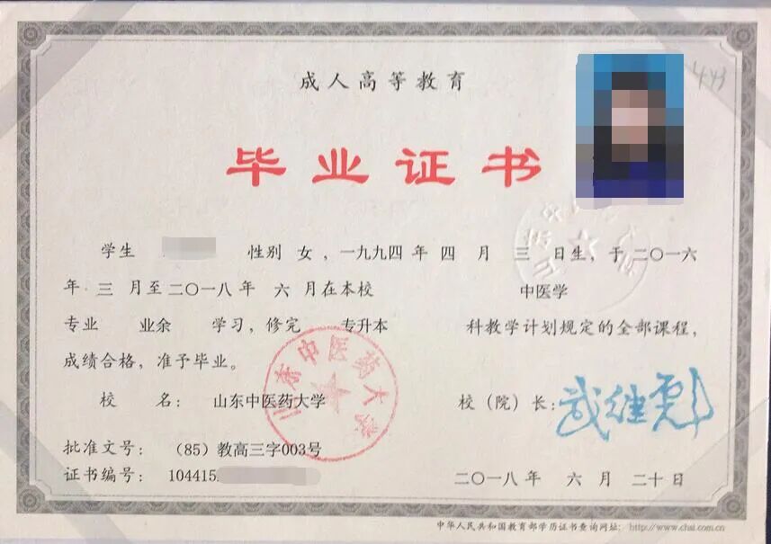 山东中医药大学成人高考毕业证书: