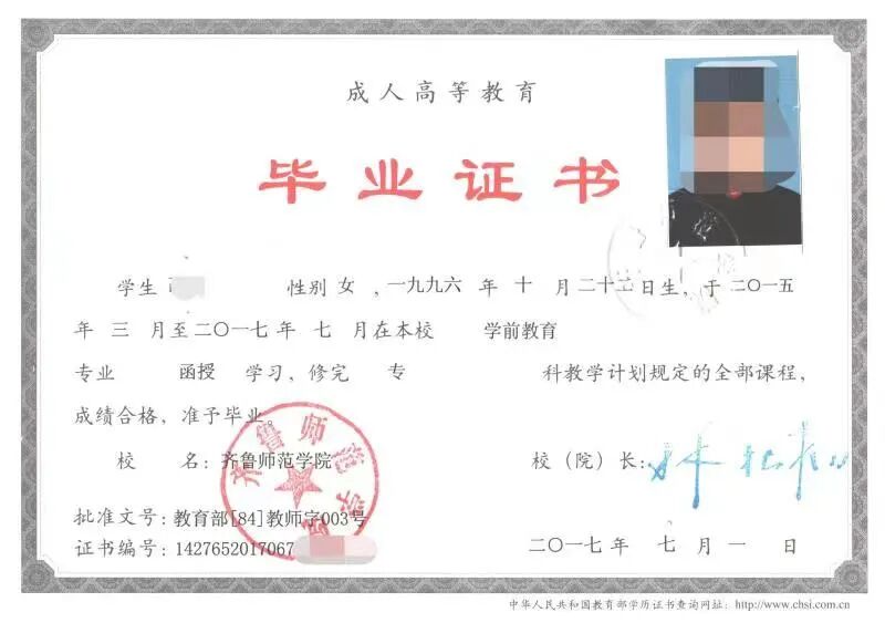 齐鲁师范学院成人高考专科毕业证书: