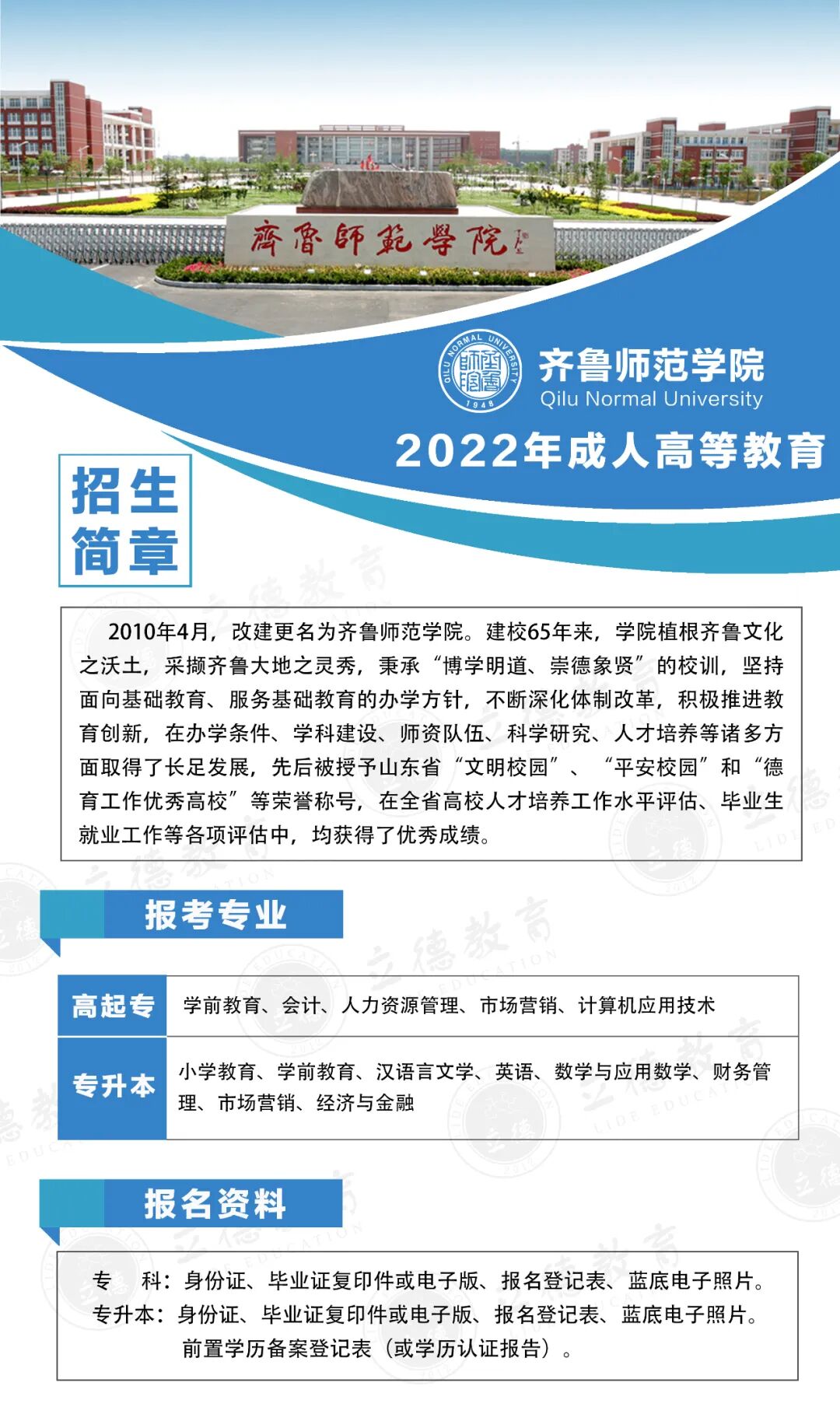 2022年齐鲁师范学院成人高考招生简章(专业计划)
